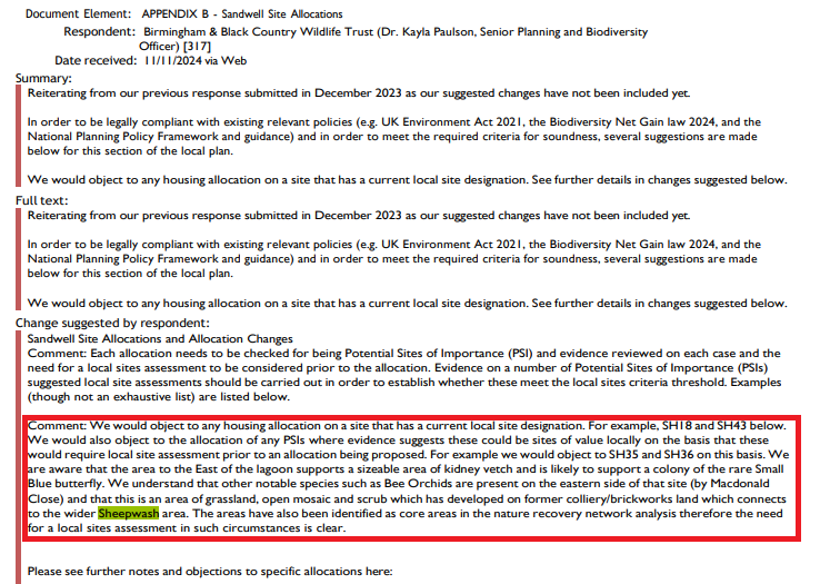 The Birmingham and Black Country Wildlife Trust specifically also mentioned this area and this species in their submission to Sandwell council, see below.
