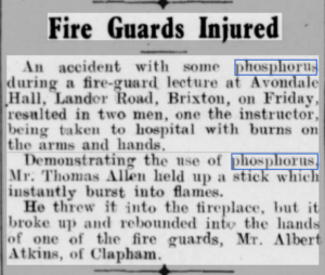One example below from the 7th August 1942 Norwood Press and Dulwich Advertiser shows how one hapless lecture resulted in burns injury to an instructor after throwing burning phosphorus into a fire! With fools like this it is a wonder as to how Britain kept going and managed to fan the flames from self inflicted defeat.