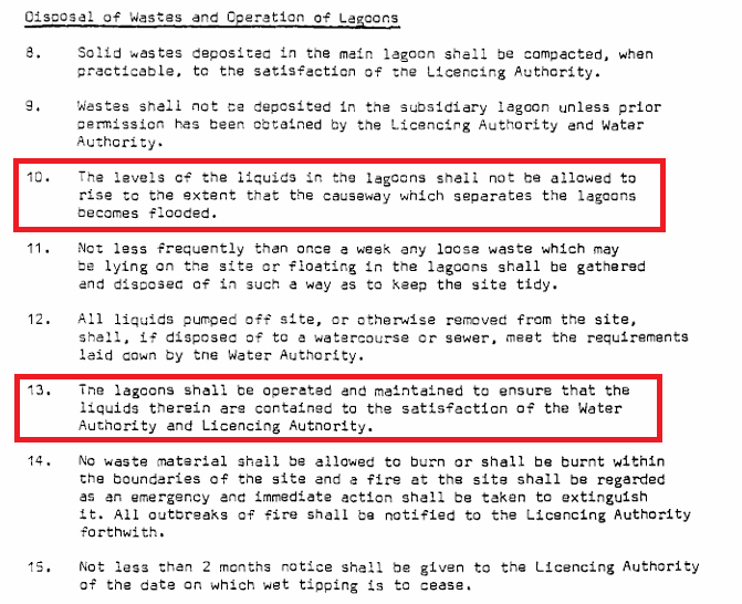 Over time, and with the useless environment agency supposedly regulating this site under the shite SL31 licence passed in 1978, Condition 10 of the licence required AW and later Rhodia to not allow water to rise above the so called “clean side” lagoon, this is specifically mentioned, as well as Condition 13 requiring the lagoons to be operated to the satisfaction of the regulator.